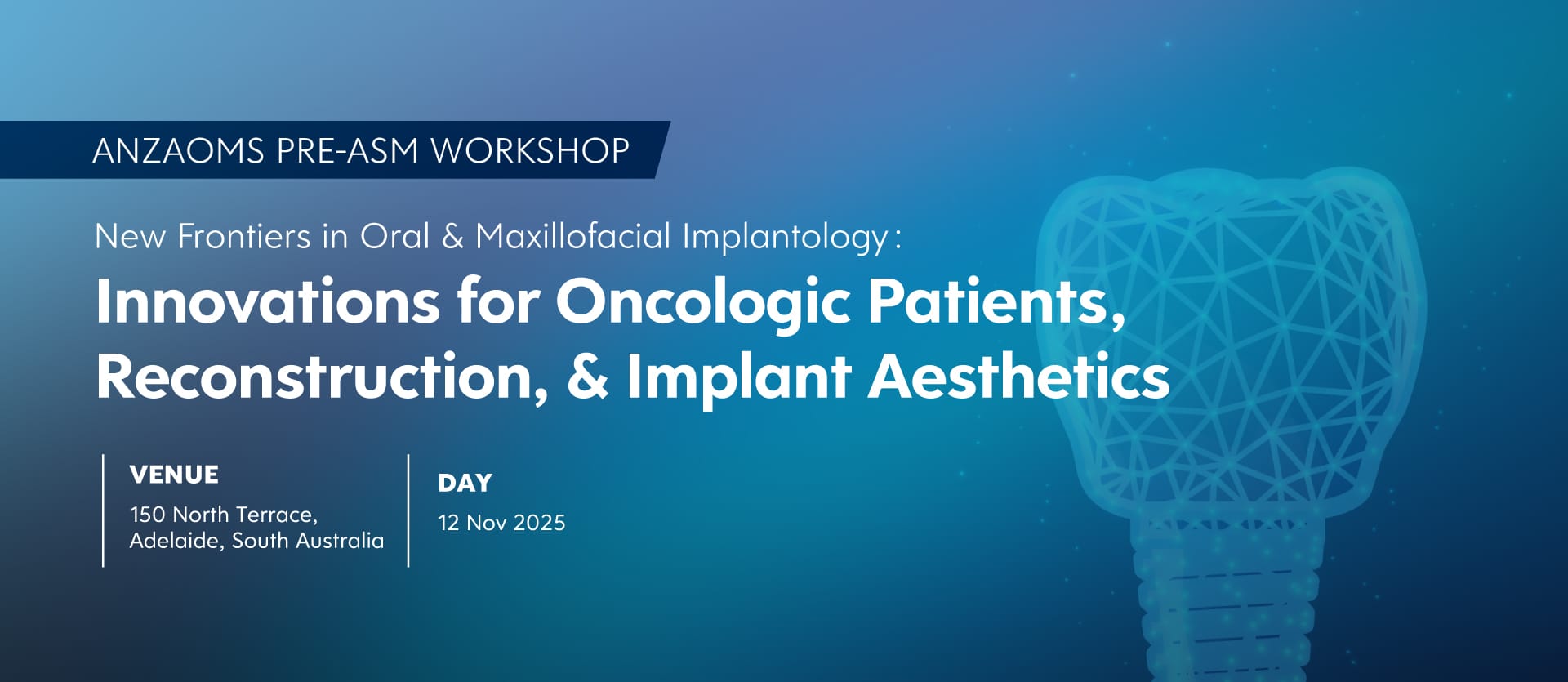 This ANZAOMS pre-ASM workshop program is designed for oral and maxillofacial surgeons seeking to expand their expertise in advanced implant treatment modalities for complex patient cases. The sessions will explore state-of-the-art approaches in the management of oncologic patients, focusing on implant surgical and prosthetic protocols that optimize both survival and quality of life. Cutting-edge techniques in jaw reconstruction with implants will be highlighted, emphasizing functional and aesthetic outcomes through the integration of microvascular surgery, digital planning, and biomaterials.